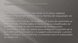 Cuadernia es una herramienta digital gratuita que permite crear libros interactivos multimedia llamados cuadernos digitales. Ofrece funciones para diseñar páginas con diferentes elementos como texto, imágenes, sonido y video y compartir los cuadernos a través de internet. El documento explica detalladamente los pasos para crear y modificar cuadernos digitales utilizando las diversas herramientas y opciones disponibles en Cuadernia.