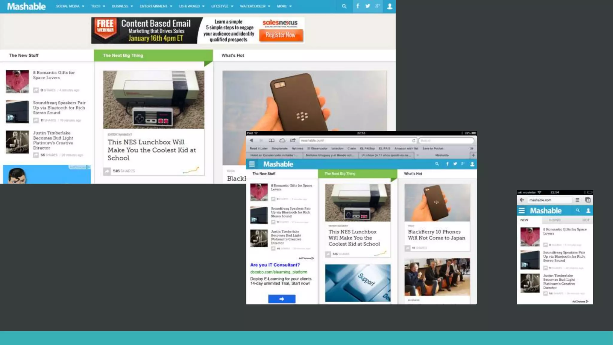 El documento habla sobre el diseño de sitios web adaptables y móviles. Explica que el diseño adaptable proporciona un mismo código que se ajusta al tamaño de pantalla para todos los dispositivos. Las ventajas incluyen mejor SEO, experiencia de usuario y menor costo de mantenimiento. También discute la importancia de crear contenido para móviles dado que más del 50% del tráfico viene de estos dispositivos y los usuarios esperan sitios rápidos y optimizados.