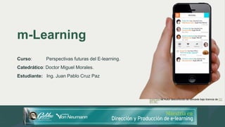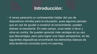 El documento presenta una introducción al concepto de m-Learning, que se refiere al aprendizaje basado en la tecnología móvil. Explica que el m-Learning combina la computación móvil y el e-learning para brindar recursos educativos de forma accesible. Luego, describe las características, ventajas y desventajas del m-Learning, así como los tipos, tendencias e importancia de esta modalidad de aprendizaje. Finalmente, concluye que a medida que los dispositivos móviles mejoren, el m-Learning