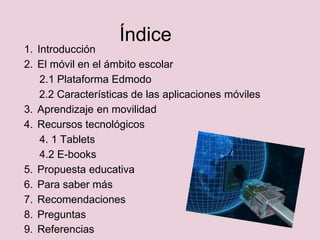 El documento aborda el mobile learning y la integración de dispositivos móviles, tablets y e-books en la educación, destacando su relevancia en el ámbito escolar y la necesidad de adaptarlos a las programaciones de aula. Se presentan recursos tecnológicos, características de aplicaciones y plataformas como Edmodo, así como propuestas y recomendaciones educativas. Además, se incluyen preguntas y referencias sobre el uso de las TIC en el aprendizaje en movilidad.