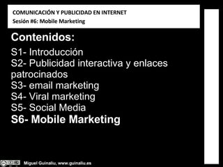 El documento presenta una sesión sobre marketing móvil. Explica que el 90% de la población española tiene cobertura móvil y que es el sector líder en Europa, con un incremento anual del 7.5%. Además, analiza las oportunidades del marketing móvil más allá de las llamadas, su mayor retorno de inversión comparado con otros medios, y formas de interacción como hacer clic para llamar, localizar, solicitar información o descargar contenidos. Finalmente, describe canales como la web móvil, mensajería, video