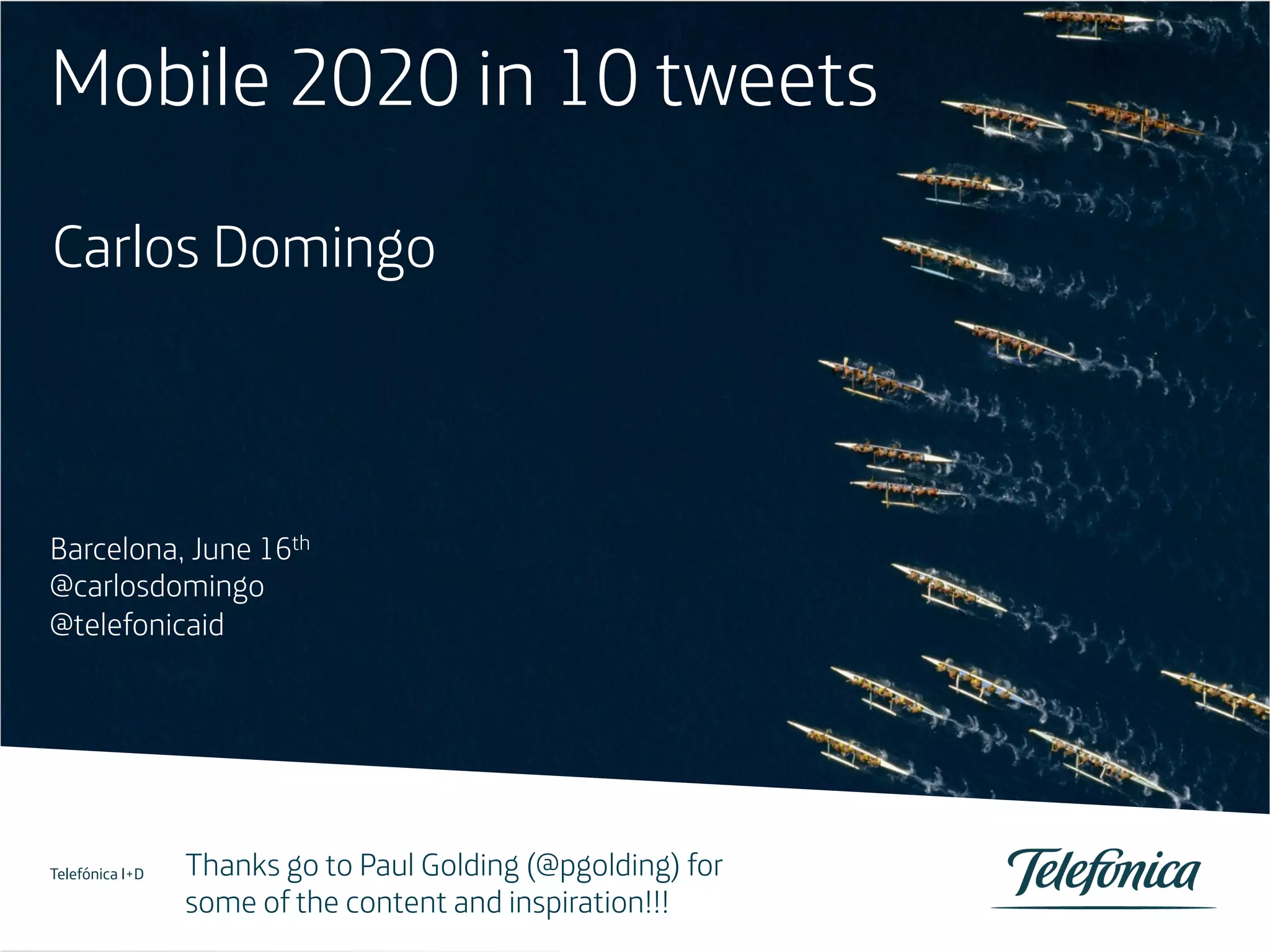El documento resume 10 tweets de Carlos Domingo sobre las predicciones para 2020 en el mundo móvil. Se prevé que los teléfonos móviles se convertirán en una herramienta multifunción con sensores, que surgirán redes personales para comunicarse con objetos y sensores, y que los teléfonos controlarán todo de forma remota. También habrá aplicaciones más contextuales y una explosión de video, incluidas comunicaciones por video. Se espera que haya más de 50.000 millones de objetos recopilando datos y que los desafíos para