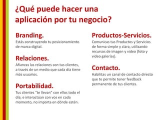 Mobilefact ofrece una solución para crear aplicaciones personalizadas para iPhone que facilitan el branding y la comunicación con clientes. La app incluye características como módulos personalizables, galerías de fotos y videos, y opciones de contacto directo, permitiendo interacción constante. Además, se contemplan opciones de escalabilidad y registro de usuarios para funcionalidades adicionales.