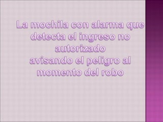 El documento habla sobre una empresa pequeña llamada MOCHILA ACME ubicada en Quito que se dedica a la venta de mochilas con alarma. La empresa busca ser exitosa mediante la venta de este producto seguro y novedoso que evita el robo. Ofrecen varios modelos de mochilas a precios accesibles con garantía. Dentro de la mochila se encuentra la alarma de manera oculta.
