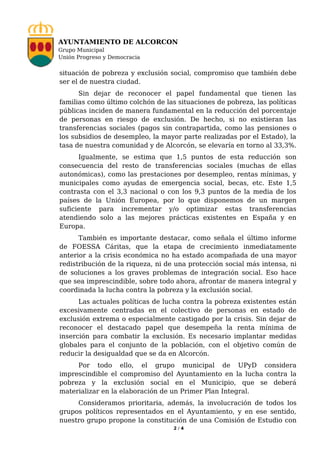 El documento propone la creación de una Comisión de Estudio para analizar la situación de pobreza y exclusión social en Alcorcón y elaborar un dictamen. Se pide al Ayuntamiento que ponga en marcha medidas urgentes para combatir la pobreza, como en educación, vivienda, empleo, salud y servicios sociales. La Comisión debería elaborar un Plan Integral de lucha contra la pobreza y exclusión social para 2013-2015 basado en sus conclusiones.