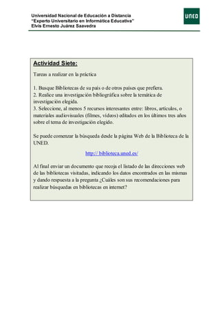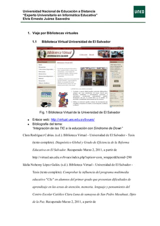 Este documento presenta las tareas a realizar en la práctica de una actividad sobre bibliotecas virtuales. Incluye instrucciones para buscar bibliotecas en línea y realizar una investigación bibliográfica sobre la integración de las TIC en la educación de personas con Síndrome de Down, seleccionando al menos 5 recursos relevantes de los últimos 3 años. También incluye enlaces a bibliotecas virtuales como la de la UNED, UCA de El Salvador y YouTube, con información sobre el tema de investigación.