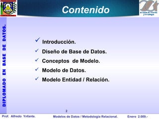 Este documento presenta una introducción a un diplomado en base de datos. Explica conceptos clave como modelo de datos, diseño de base de datos y modelo entidad-relación. También incluye el contenido del curso sobre modelos de datos y metodología relacional.