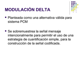 Este documento resume los principios básicos de la modulación delta y sigma-delta. La modulación delta sobremuestrea la señal de entrada y cuantifica la diferencia entre la muestra actual y la aproximación previa en solo dos niveles. La modulación sigma-delta integra la señal antes de la cuantificación para mejorar la correlación entre muestras. La modulación PCM diferencial codifica la diferencia entre la muestra actual y la predicción en lugar de la muestra completa para eliminar redundancia.
