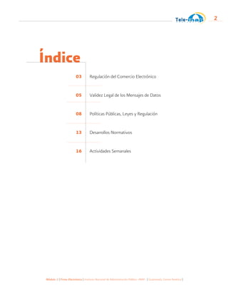 Este documento trata sobre la regulación del comercio electrónico en Guatemala. Explica conceptos clave como comercio electrónico, validación legal de mensajes de datos, políticas públicas y desarrollos normativos relacionados. También describe actores del comercio electrónico, tecnologías subyacentes como Internet, y marcos regulatorios a nivel internacional y en América Latina para promover la competitividad económica a través de las tecnologías de la información.