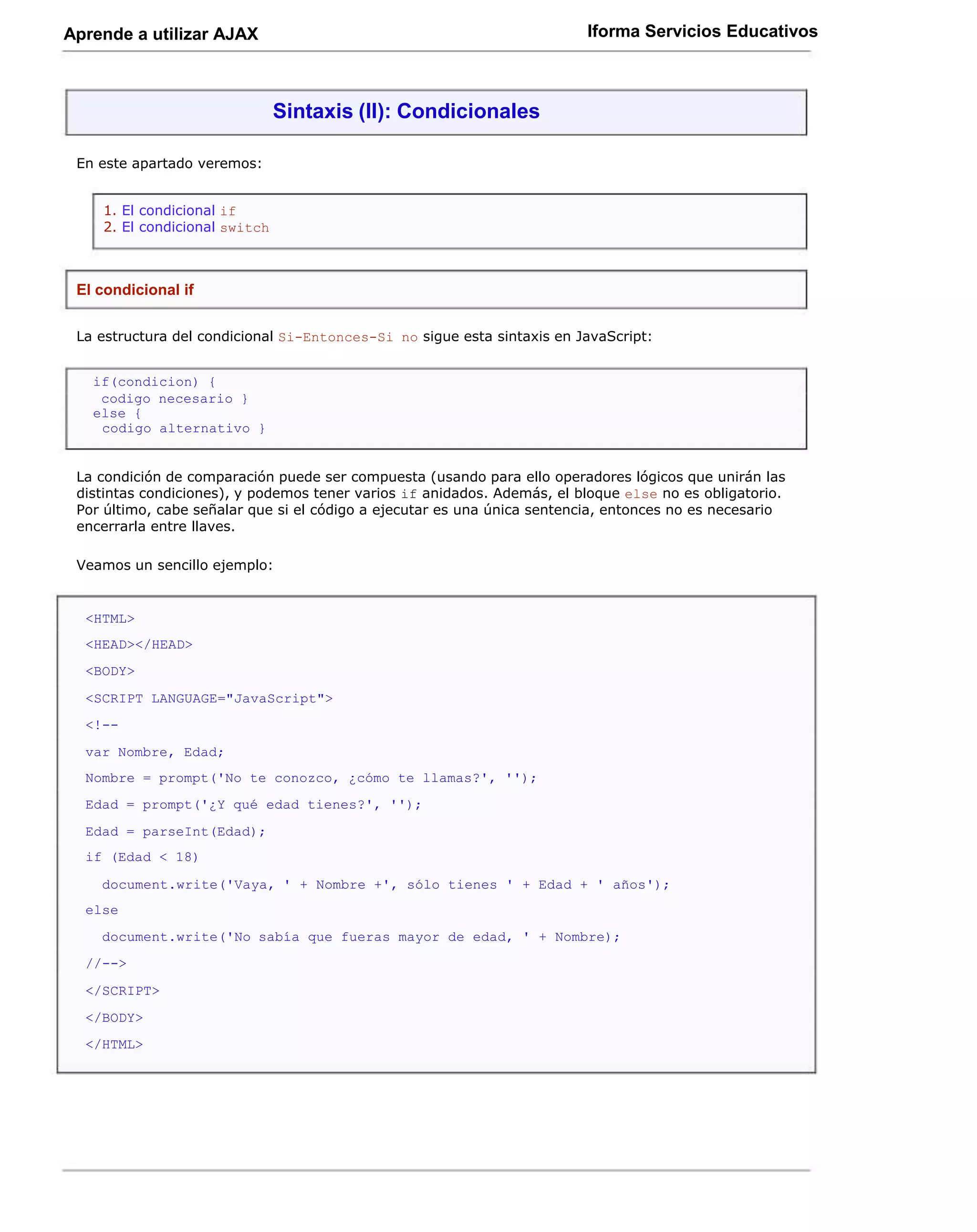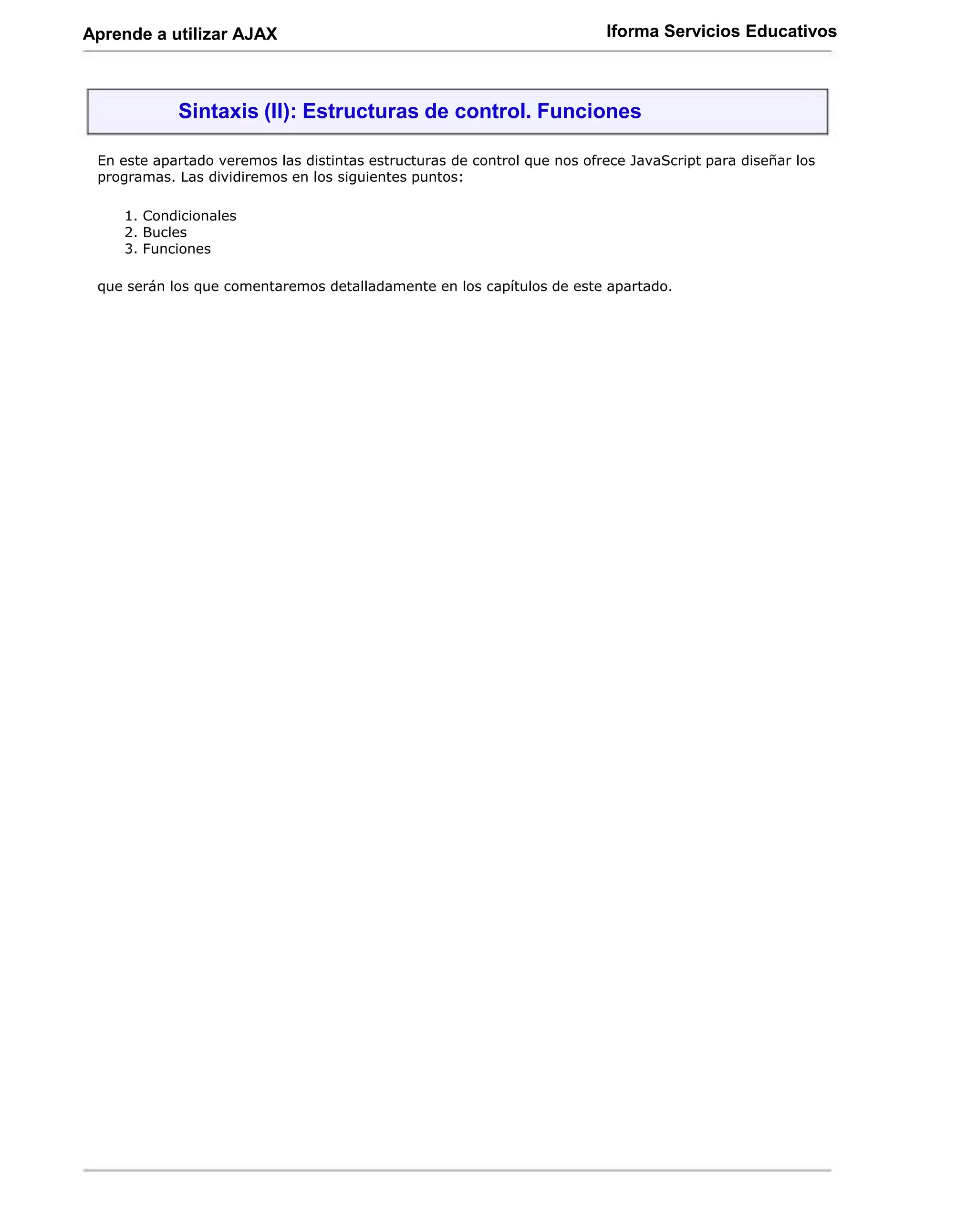 Este documento describe diferentes estructuras de control en JavaScript como condicionales, bucles y funciones. Explica el uso de if/else, switch, for, while, do/while y funciones para controlar el flujo de un programa. También cubre temas como bucles for/in, la construcción with y el paso de argumentos a funciones.