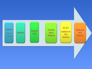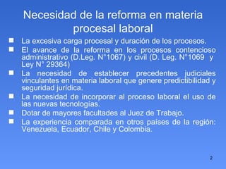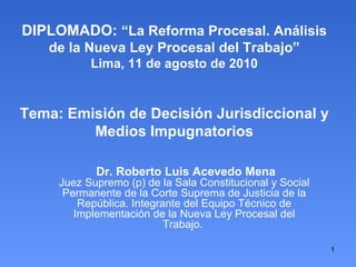 El documento habla sobre la emisión de decisiones jurisdiccionales y medios impugnatorios en la nueva Ley Procesal del Trabajo de Perú. Describe las características del proceso anterior y la nueva ley, incluyendo mayor oralidad, celeridad, concentración y uso de tecnología. También cubre temas como sentencias, motivación, facultades del juez y procesos ordinarios laborales.