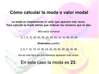 La moda de un conjunto de datos es el valor que aparece con más frecuencia. Para calcular la moda, se ordenan los números de menor a mayor y se identifica cuál se repite más veces. En este ejemplo, después de ordenar los números de 3 a 56, el valor 23 aparece 5 veces, por lo que la moda del conjunto de datos es 23.