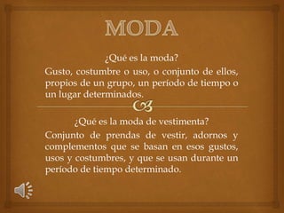 Este documento define la moda como los gustos, costumbres y usos propios de un grupo o lugar en un período determinado. Explica que la moda de vestimenta son las prendas, adornos y complementos basados en esos gustos y usos. También explora los orígenes del vestir y cómo ha evolucionado para reflejar factores como el clima, la posición social, la religión y la diferenciación sexual. Finalmente, analiza cómo la vestimenta se ha usado a lo largo de la historia para comunicar significados culturales y cómo interpretamos