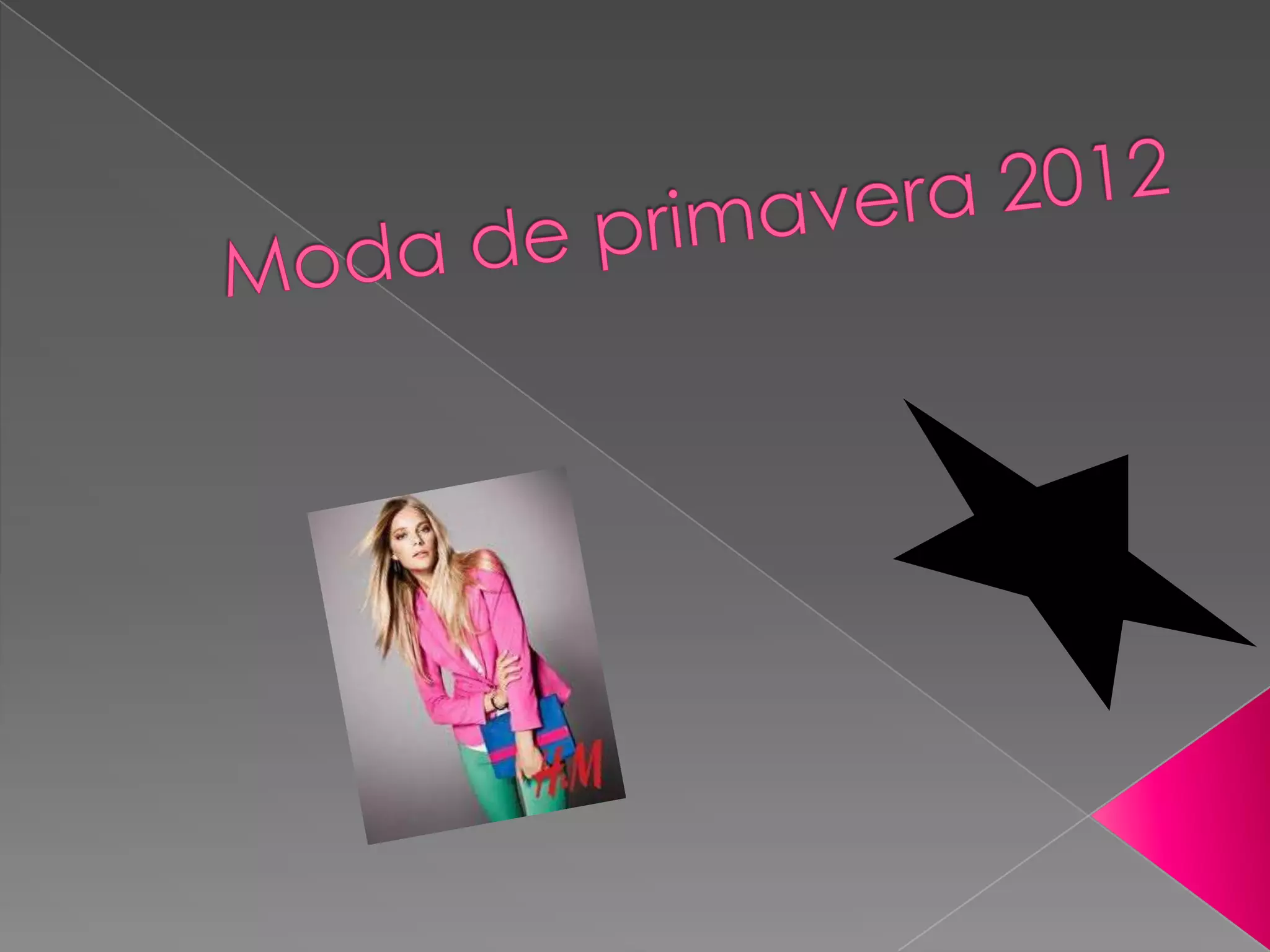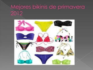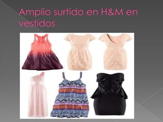 La nueva colección primavera-verano 2012 de H&M incluye vestidos, accesorios, bikinis, ropa, pantalones, shorts, collares, pulseras y bolsos bonitos. El documento también describe las nuevas tendencias de color como amarillo, azul, fucsia, verde y naranja usados en prendas alegres y energéticas del catálogo de El Corte Inglés. Las blusas de gasa son versátiles y pueden combinarse con diferentes prendas, yendo ceñidas en la cadera.
