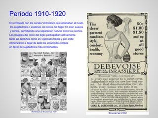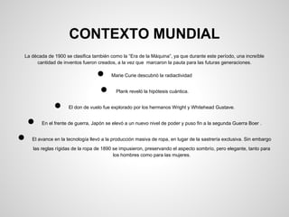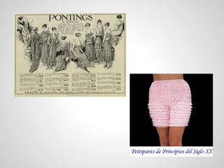 El documento resume la moda y estilos de vida a principios del siglo XX en Uruguay y a nivel mundial. La vestimenta femenina incluía lencería como corsés y enaguas, que gradualmente fueron reemplazados por sujetadores y pantaletas más cómodas. Los hombres usaban trajes formales con levita, chaleco y sombrero. Los espacios de ocio eran parques, playas y eventos como corridas de toros.