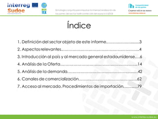 Este documento presenta un estudio de mercado del sector de la moda en Estados Unidos. Incluye un análisis de la oferta, la demanda, los canales de distribución y los procedimientos de importación en el mercado estadounidense. El mercado de la moda en EE.UU. depende casi totalmente de las importaciones debido a la reducción de la producción interna. El comercio electrónico es cada vez más importante como canal de distribución, mientras que las tiendas físicas pierden cuota de mercado. China, México, Canadá