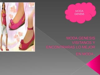 El documento promociona la tienda Moda Genesis, la cual ofrece la mejor ropa y accesorios de temporada para renovar el armario. Cuenta con los últimos diseños y tendencias de primavera/verano, incluyendo vestidos, blusas, pantalones, bolsas, carteras, zapatos, perfumes y más. Su misión es que las clientas se sientan bien a través de la moda que venden.