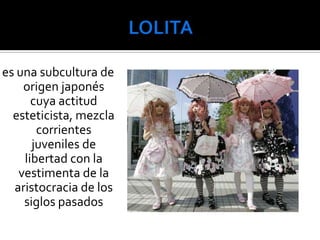 Este documento resume varios estilos y subculturas de la moda japonesa, incluyendo Lolita, Harajuku, cosplay, kigurumi, gyaru, visual kei y kodona. Describe brevemente los orígenes, características y elementos distintivos de cada uno.