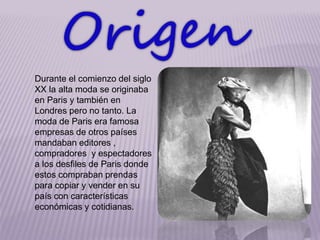 El documento describe la evolución de la moda a lo largo del siglo XX. En los primeros años, París y Londres eran los principales centros de alta moda, y las revistas de moda ayudaron a difundir los nuevos diseños parisinos. Tras la Segunda Guerra Mundial, París dejó de ser el centro mundial de la moda, y la moda prêt-à-porter ganó popularidad. En las últimas décadas del siglo, los estilos occidentales se extendieron por todo el mundo y los diseñadores no
