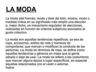 La moda se refiere a las tendencias repetitivas de ropa, accesorios y estilos de vida que las personas adoptan o dejan de usar basadas en criterios subjetivos asociados al gusto colectivo. A lo largo de la historia, la moda ha sido influenciada por monarcas, nobles, revistas femeninas, estrellas de cine y música famosas que imponían nuevos estilos. Hoy en día, la industria de la moda continúa creando demanda para nuevas prendas a través de desfiles, revistas, anuncios