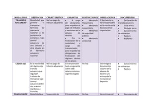 El documento define y describe varias modalidades de tránsito aduanero en Ecuador, incluyendo tránsito aduanero terrestre, cabotaje, transporte multimodal, transbordo y otras disposiciones. Cada modalidad especifica si requiere pago de tributos aduaneros, tipo de garantía requerida, restricciones y documentos necesarios.