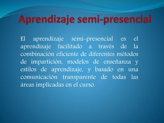 El aprendizaje semi-presencial combina métodos de enseñanza presenciales y virtuales para facilitar un aprendizaje flexible, estructurado y centrado en el estudiante. Este modelo fomenta un aprendizaje significativo desarrollando conocimientos de forma autónoma a través de actividades presenciales y recursos virtuales, manteniendo una buena comunicación entre maestros y alumnos.