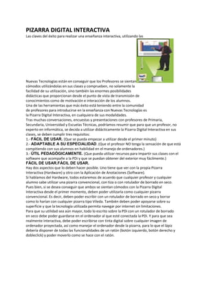 El documento describe las ventajas de una pizarra electrónica interactiva para la enseñanza, incluyendo que permite crear un aula virtual en cualquier lugar, interactuar con contenidos proyectados de forma digital, y generar ambientes de colaboración.