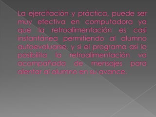 Este documento describe la modalidad educativa de ejercitación y práctica, la cual se enfoca en la adquisición de habilidades a través de la repetición de tareas y ejercicios. Esta modalidad es la más común en educación asistida por computadora y busca la memorización y automatización del conocimiento de manera indirecta a través de la práctica. Un ejemplo efectivo es el uso de tarjetas "flash" que refuerzan el conocimiento a través de la repetición de operaciones sencillas.