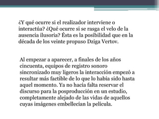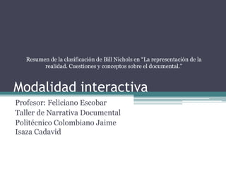 El documento analiza la clasificación de Bill Nichols sobre el documental interactivo y su evolución desde la intervención del realizador, lo que permite una interacción más directa entre el realizador y los actores sociales. Se discuten las implicaciones éticas y políticas de las relaciones entre realizador y testigos, así como las diferentes modalidades de entrevista que afectan la representación y la percepción de la realidad en el documental. La obra destaca cómo estas interacciones transforman la narrativa, centrándose en la voz de los testigos en lugar de un discurso autoral tradicional.