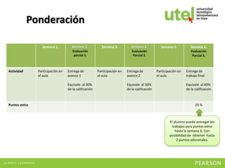Este documento describe una modalidad de trabajo por proyectos dividida en 6 semanas. Los estudiantes recibirán una calificación parcial cada 2 semanas por la entrega de avances que representan el 30% de la calificación cada uno, y el trabajo final en la semana 6 que representa el 40%. También pueden obtener hasta 2 puntos extra entregando trabajos adicionales. El documento explica cómo conducir esta modalidad, incluyendo la elaboración de una tabla de especificaciones y la evaluación de cada entrega.