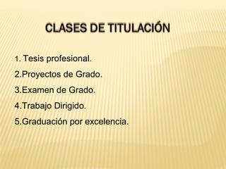 Este documento describe los requisitos y procedimientos para varias modalidades de grado en una universidad, incluyendo tesis, proyectos de grado, exámenes de grado, trabajo dirigido y graduación por excelencia. Estos trabajos finales requieren entre 400 y 540 horas de trabajo y la supervisión de un tutor, y deben cumplir con estándares de metodología científica. El documento también proporciona detalles sobre la estructura y contenido requerido para cada tipo de trabajo de grado.