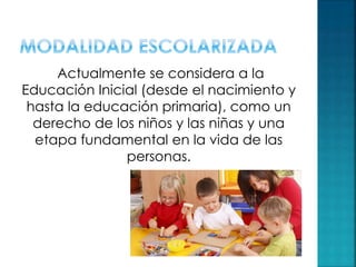 El documento describe los diferentes niveles y modalidades de educación en México, incluyendo la educación inicial desde el nacimiento hasta los 4 años, la educación primaria de los 6 a los 11 años, la educación secundaria de los 12 a los 15 años, la educación especial para estudiantes con discapacidades, y la educación superior como el bachillerato. La educación inicial busca desarrollar valores e habilidades en los niños pequeños, mientras que los niveles posteriores se enfocan en enseñar lectura, escritura, matemáticas y otras