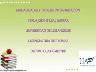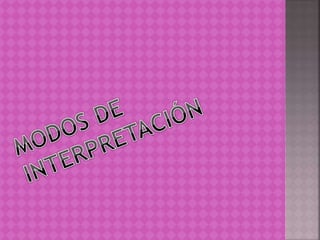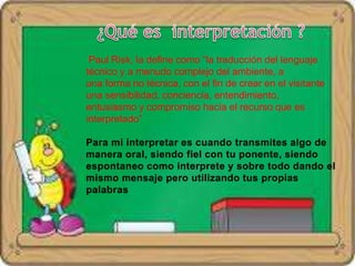 El documento habla sobre la interpretación y sus diferentes tipos y modalidades. Define la interpretación como la traducción del lenguaje técnico a uno no técnico para crear conciencia sobre un recurso. Explica que la interpretación puede determinar el lugar o evento, e indica la función del intérprete. Además, describe diferentes tipos de interpretación como simultánea, consecutiva o susurrada; y los requisitos para ser intérprete según el contexto.