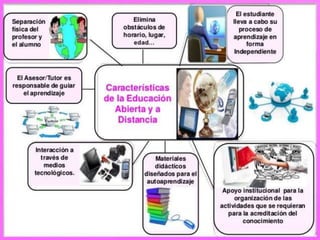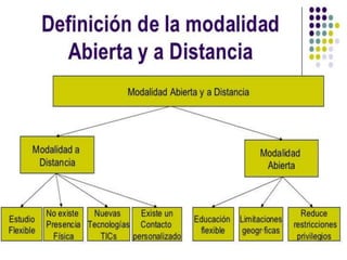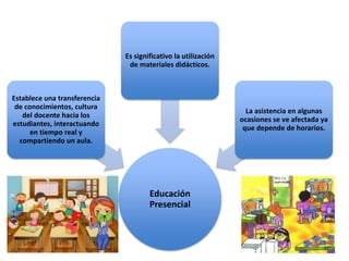 Este documento describe diferentes modalidades de educación, incluyendo la educación presencial, educación escolarizada y educación en línea. La educación presencial implica la transferencia de conocimiento en el aula a través de la interacción en tiempo real entre profesores y estudiantes. La educación escolarizada requiere que estudiantes y profesores coincidan en horarios determinados. La educación en línea utiliza recursos en internet para proporcionar una educación interactiva, multimedia, accesible y flexible.