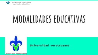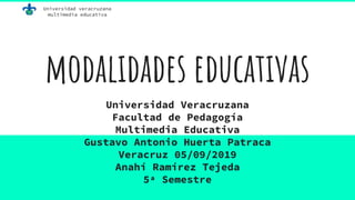 El documento describe diferentes modalidades educativas con tecnología como el e-learning, b-learning, m-learning y v-learning. Define cada modalidad, sus características y provee ejemplos. El e-learning se refiere a la enseñanza a distancia a través de Internet. El b-learning combina el aprendizaje en línea con encuentros presenciales. El m-learning utiliza dispositivos móviles para el aprendizaje. Y el v-learning implica el uso de videos con fines educativos.