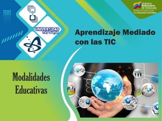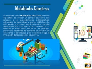 El documento aborda las modalidades educativas mediadas por TIC, describiendo su impacto en los procesos de enseñanza y aprendizaje. Se clasifica en modalidades presenciales, no presenciales y mixtas, además de detallar sus características y diferencias. La educación se adapta a las nuevas tecnologías para mejorar el aprendizaje y facilitar diversas formas de interacción entre alumnos y docentes.
