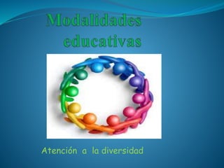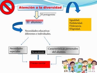 El documento habla sobre la atención a la diversidad en la educación. Propone que la educación inclusiva garantice la igualdad de oportunidades y capacidades para todos los estudiantes, incluyendo a aquellos con necesidades educativas especiales o discapacidades. También describe varios trastornos y discapacidades que deben ser atendidos, así como estrategias pedagógicas efectivas y destructivas para trabajar con estudiantes con diversas necesidades.