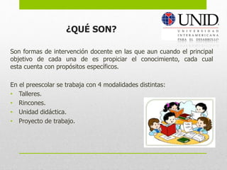 En el preescolar se utilizan 4 modalidades principales de enseñanza: talleres, rincones, unidades didácticas y proyectos de trabajo. Los talleres se enfocan en enseñar técnicas específicas bajo la guía del docente. Los rincones permiten explorar los intereses de los estudiantes a través del juego libre con poca intervención del docente. Las unidades didácticas abordan temas relacionados a la realidad natural y social. Los proyectos de trabajo surgen de los intereses de los estudiantes y combinan
