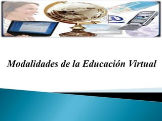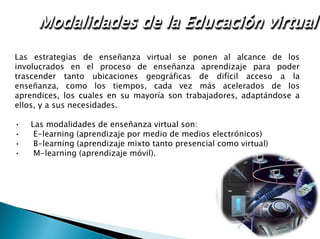 Este documento describe tres modalidades de educación virtual: e-learning, b-learning y m-learning. El e-learning se basa completamente en medios electrónicos, el b-learning combina lo presencial y lo virtual, y el m-learning se centra en el aprendizaje móvil a través de dispositivos portátiles. También se explican las características clave de cada modalidad, como la flexibilidad, la eliminación de barreras espacio-temporales, y el foco en el estudiante como centro del proceso de aprendizaje.