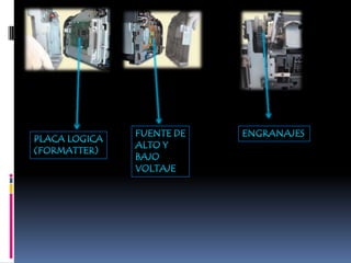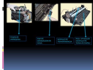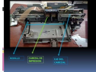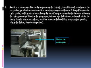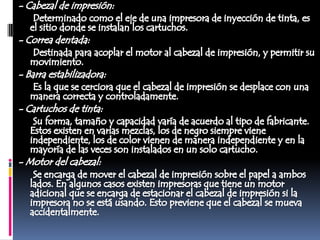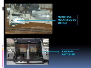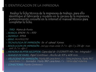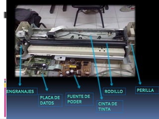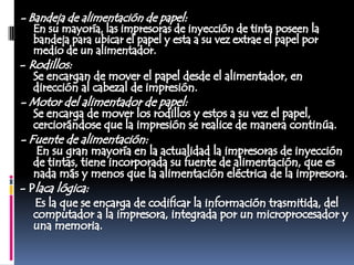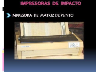 Las impresoras matriciales funcionan mediante un cabezal que contiene agujas que se activan para formar caracteres e imprimir sobre una cinta con tinta. El papel avanza a través de un rodillo mientras el cabezal se mueve para completar la impresión. Ofrecen bajo costo pero baja calidad.