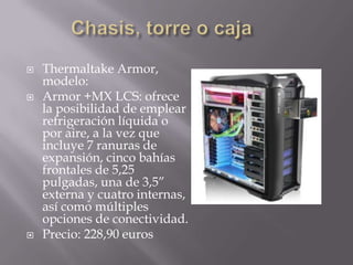 Este documento describe las especificaciones de los componentes de una computadora personalizada para juegos (modding). Incluye información sobre la caja Thermaltake Armor MX, memoria Kingston HyperX de 4GB, procesador Intel Xeon X7560 de 8 núcleos, placa base ASUS M4A79T DELUXE, tarjeta de video Nvidia GTX 480, disipador Thermaltake Fanless 330, y sistema de refrigeración líquida Thermaltake PW850i. También proporciona los precios de cada componente.
