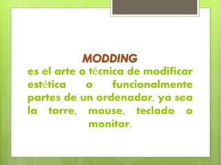 El modding de PC es la modificación estética o funcional de partes de una computadora como la torre, mouse, teclado o monitor. Algunas modificaciones comunes incluyen cambiar los LED por otros más potentes o de diferentes colores, pintar el interior o exterior, agregar ventiladores y elementos de iluminación. Las herramientas que usan los modders incluyen una Dremel, aerógrafos, pistola termofusible y destornilladores. El modding de PC en Colombia comenzó hace unos doce años y se ha vuelto más popular a través