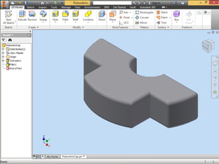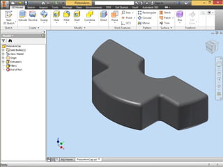 Este documento describe cómo modelar una pieza de piston arm en Autodesk Inventor 2015 utilizando operaciones básicas como simetría y revolución. Primero se crea el capa y luego se aplican las características de simetría y revolución para generar el resto de la pieza.