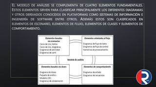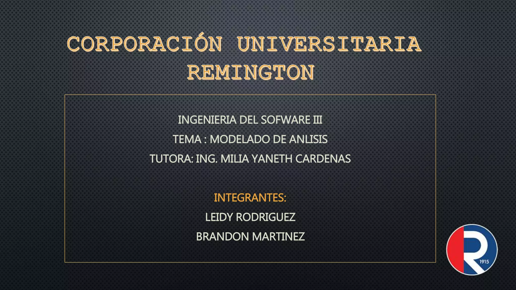 El documento presenta los temas de modelado de análisis para la asignatura de Ingeniería de Software III. La tutora es la Ing. Milia Yaneth Cárdenas e incluye a los integrantes Leidy Rodríguez y Brandon Martínez. Se describen diferentes modelos basados en escenarios como casos de uso, diagramas de actividad y de carril, así como modelos basados en clases como el modelo CRC. Finalmente, se mencionan diferentes categorías de clases.