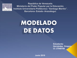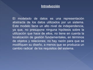 El documento trata sobre el modelado de datos. Explica que el modelado de datos es una representación abstracta de los datos utilizados por un sistema y que tiene un alto nivel de independencia. Luego describe los diferentes tipos de modelado de datos como los modelos conceptuales, lógicos y físicos. También habla sobre conceptos como la abstracción de datos, la integridad de datos y el modelo entidad-relación.