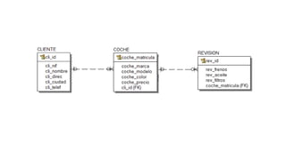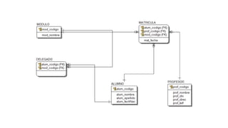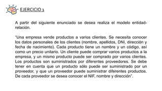 Un estudiante presenta 6 ejercicios de modelado de entidades y relaciones a partir de diferentes supuestos. Cada ejercicio describe un escenario diferente que involucra entidades como clientes, productos, proveedores, profesores, alumnos, médicos, pacientes e incluye los atributos relevantes de cada entidad así como las relaciones entre ellas.