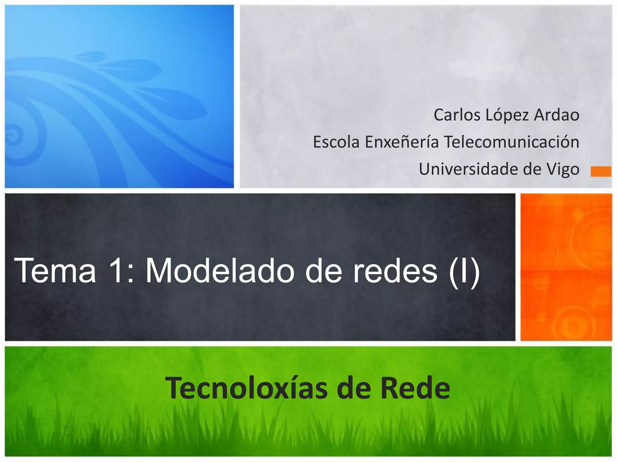 El documento presenta conceptos básicos sobre modelado de redes, incluyendo multiplexación estadística, colas, probabilidad de overflow y ancho de banda efectivo. También introduce la teoría de colas, parámetros como intensidad de tráfico y factor de utilización, y la notación de Kendall para sistemas de colas. Finalmente, explica las propiedades de la distribución exponencial y su relación con los procesos de Poisson, elementos clave para la modelización de sistemas de colas.
