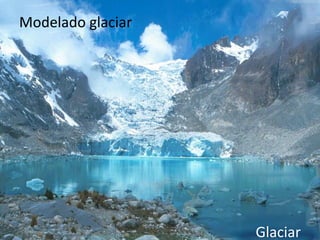El documento describe los diferentes tipos de glaciares, incluyendo glaciares de casquete y glaciares de valle, y explica las partes de un glaciar alpino como el circo y la lengua. Además, detalla las formas de erosión glaciar como los valles en U y los valles colgados, y las formas de sedimentación glaciar como las morrenas frontales, laterales y centrales.
