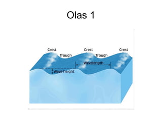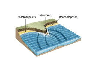 Este documento describe diferentes formas deposicionales y de erosión causadas por el modelado litoral. Explica cómo las olas, la deriva litoral y la erosión dan lugar a características como flechas litorales, barras de bahía, tómbolos e islas barrera. También describe formas de erosión como acantilados, arcos litorales, farallones y plataformas de abrasión. Finalmente, resume cómo la presión de las olas, la refracción marina y el efecto de sierra del agua contribuyen al modelado y evolución