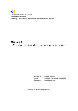 Este documento presenta una planificación didáctica para una clase sobre la división dirigida a estudiantes de tercero básico. La planificación incluye el objetivo de aprendizaje, que es demostrar la comprensión de la división en el contexto de las tablas de multiplicación hasta 10x10. También describe las actividades que incluyen representaciones concretas y pictóricas de la división, así como una evaluación a través de una pauta de cotejo.